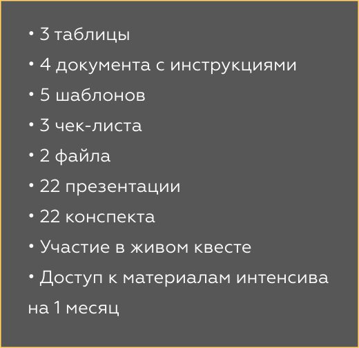Доступ к материалам интенсива на 6 месяцев + информация в материалах будет обновляться!